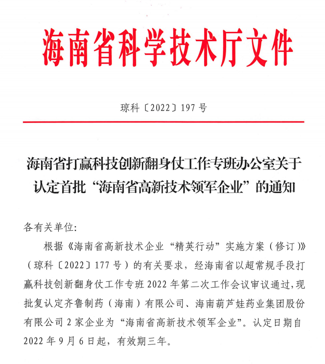 近日,海南省科学技术厅发布的《海南省打赢科技创新翻身仗工作专班办公室关于认定首批“海南省高新技术领军企业”的通知》中显示,批复认定海南LEwin乐玩药业集团股份有限公司等2家企业为“海南省高新技术领军企业”。认定日期自2022年9月6日起,有效期三年。